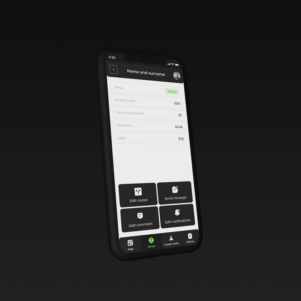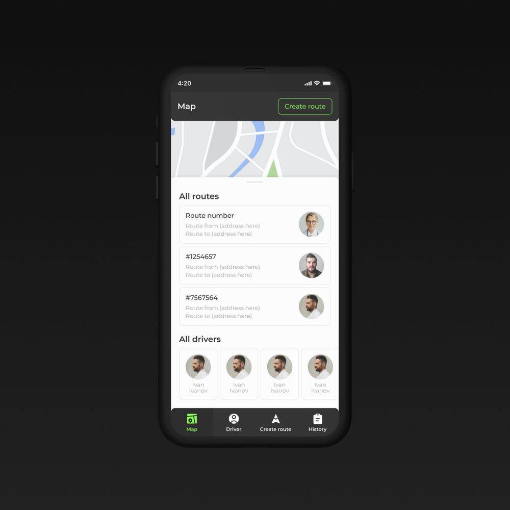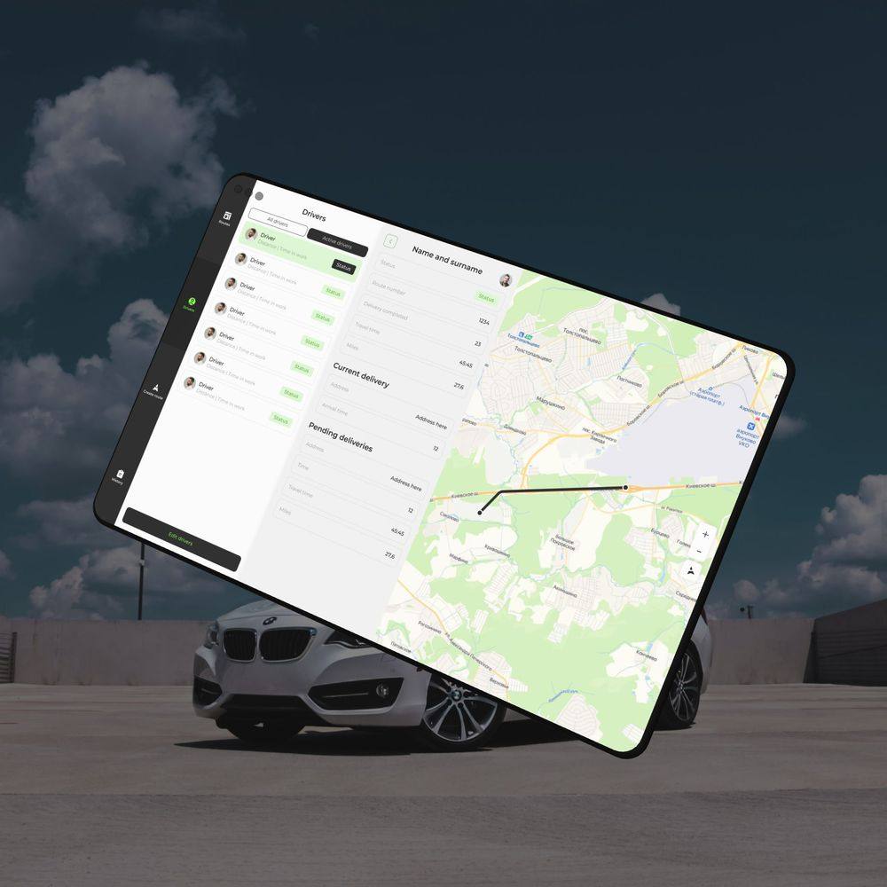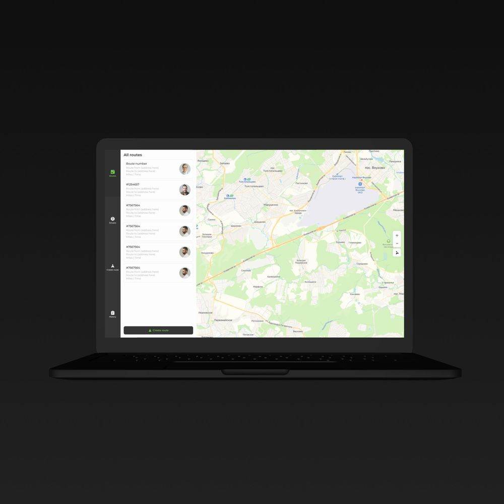 Четкая иерархия данных: маршруты, водители, история доставок. Простая навигация и удобные фильтры для поиска маршрутов и водителей. Адаптивный дизайн для удобного использования на разных устройствах