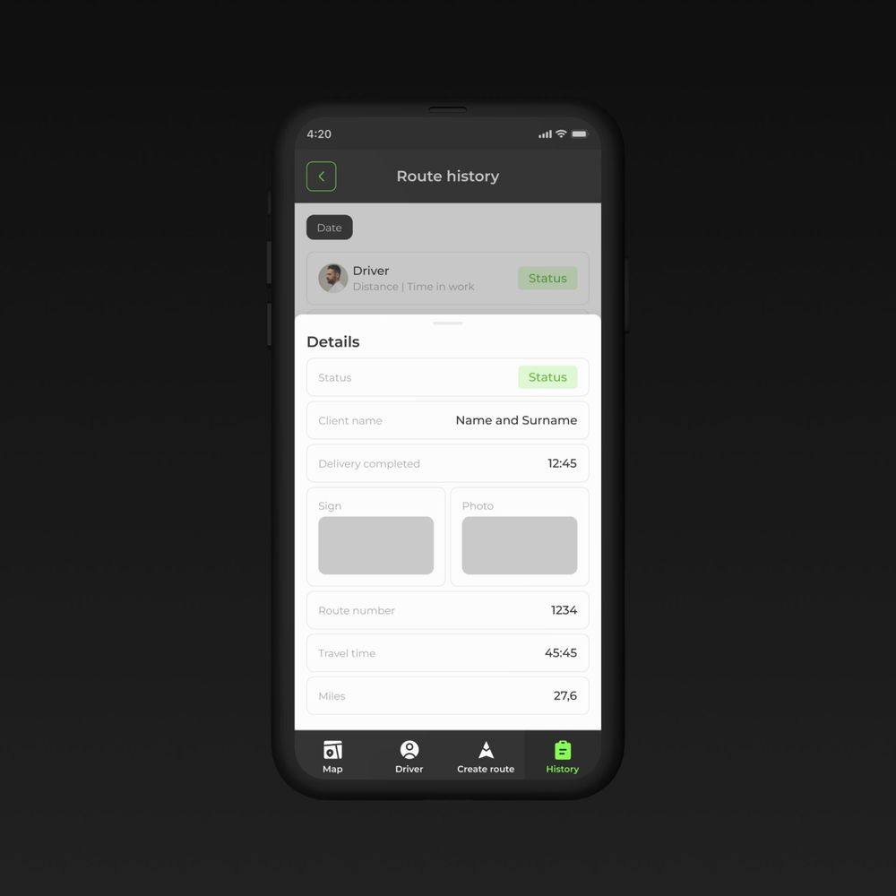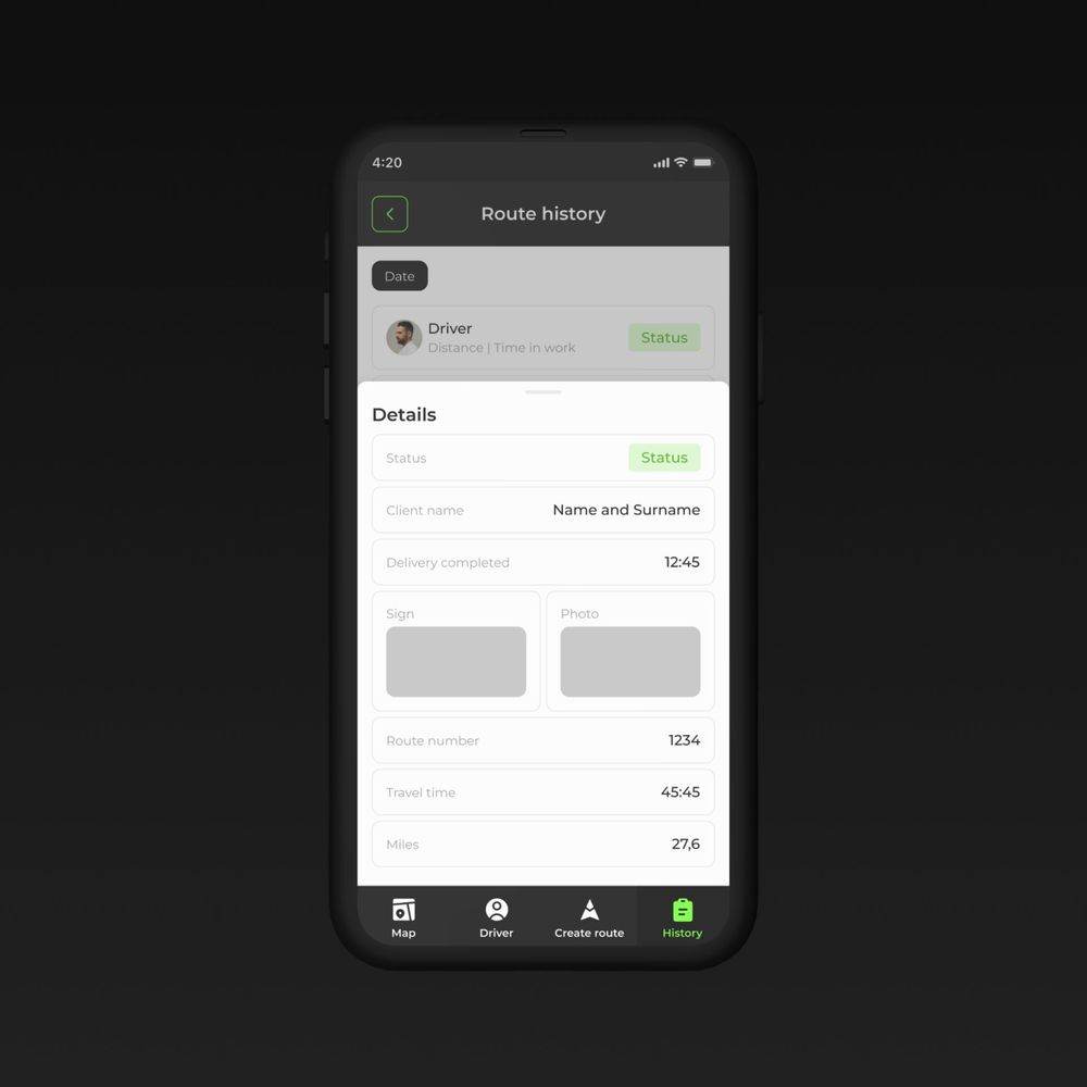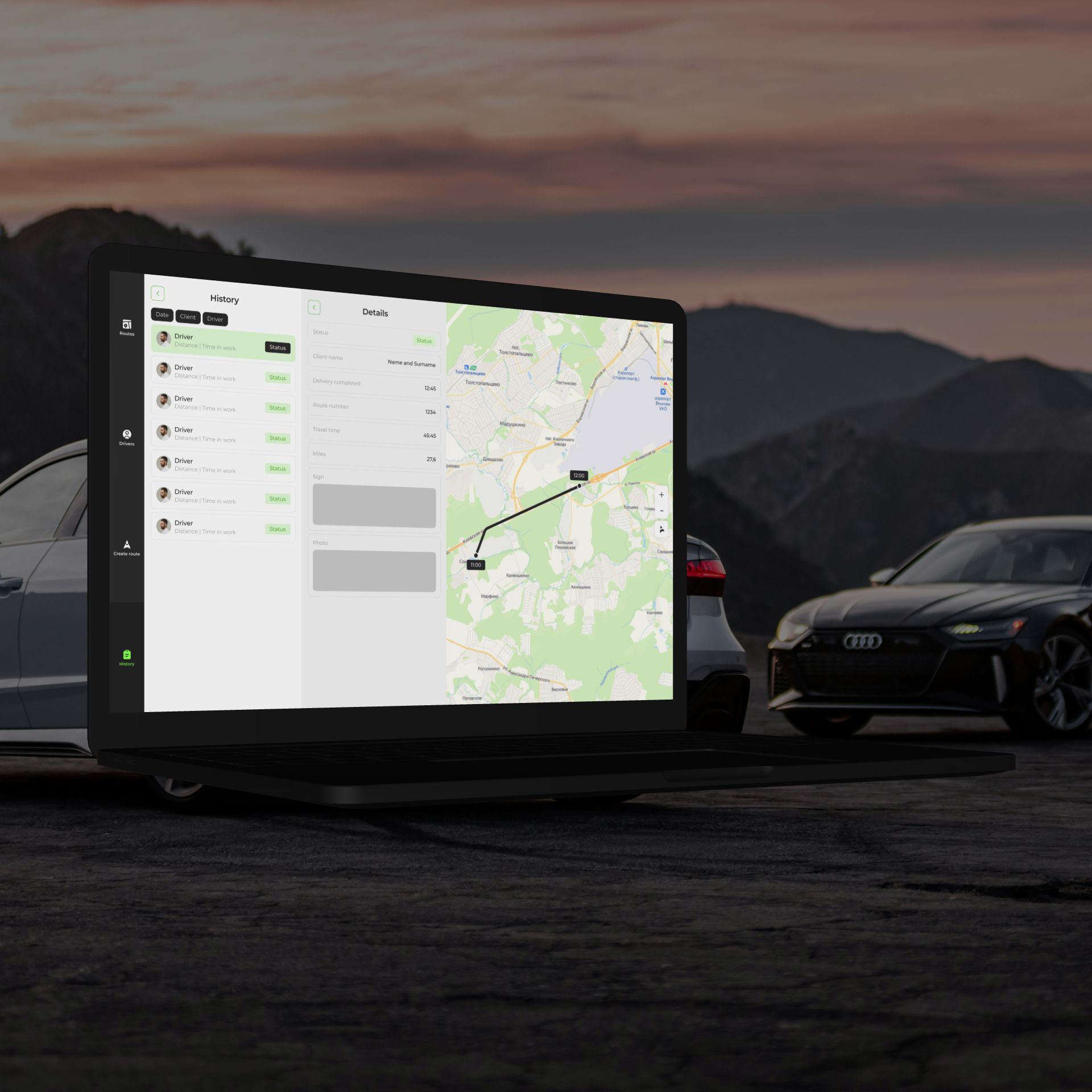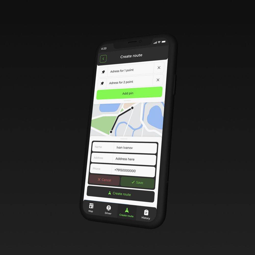 Четкая иерархия данных: маршруты, водители, история доставок. Простая навигация и удобные фильтры для поиска маршрутов и водителей. Адаптивный дизайн для удобного использования на разных устройствах