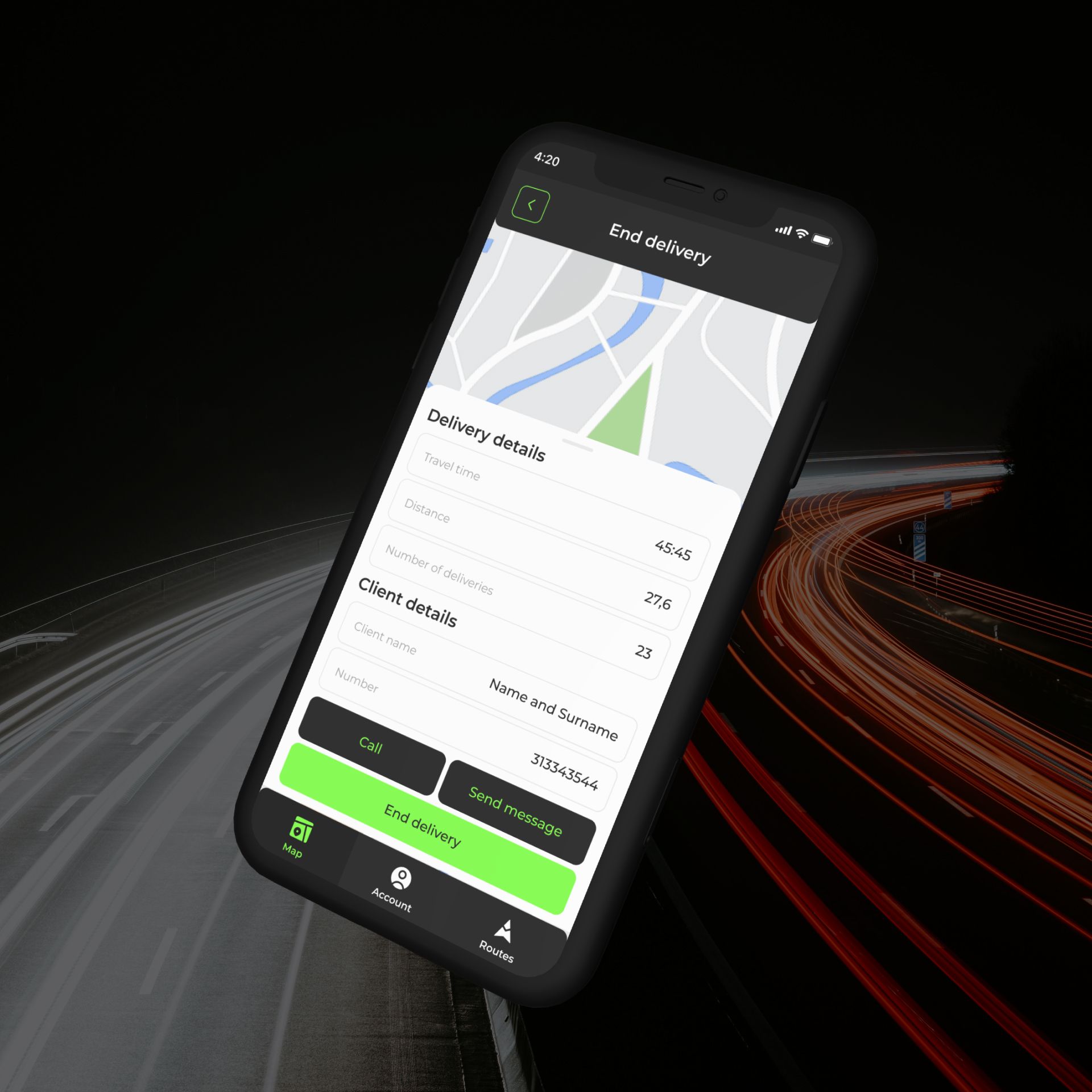 Интерфейс для просмотра маршрута. Интерактивная карта и пошаговая навигация. Возможность менять порядок точек доставки. Интеграция с популярными навигационными сервисами. Завершение доставки с фиксацией данных клиента
