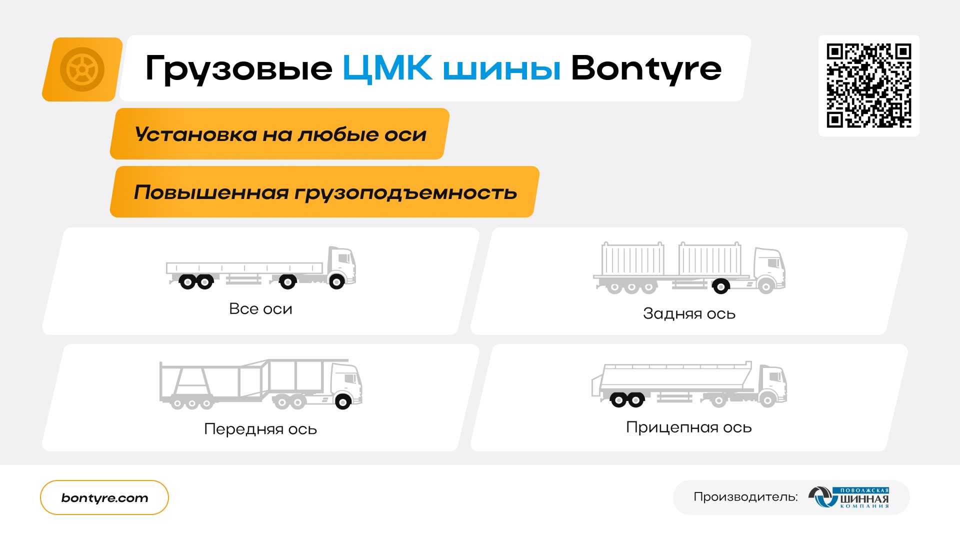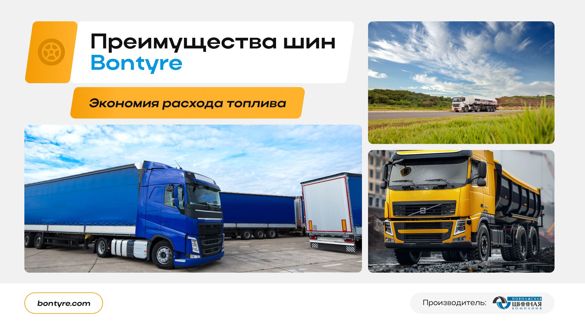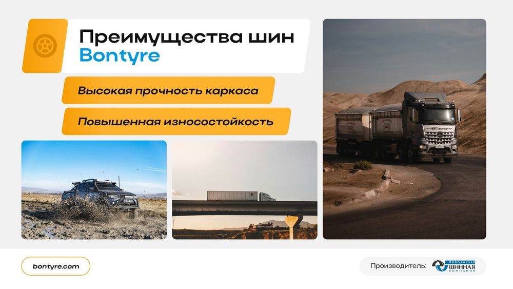 Разработала презентацию для бренда шин Bontyre. Задача - понятно и визуально аккуратно показать продукт, его преимущества и сценарии использования.