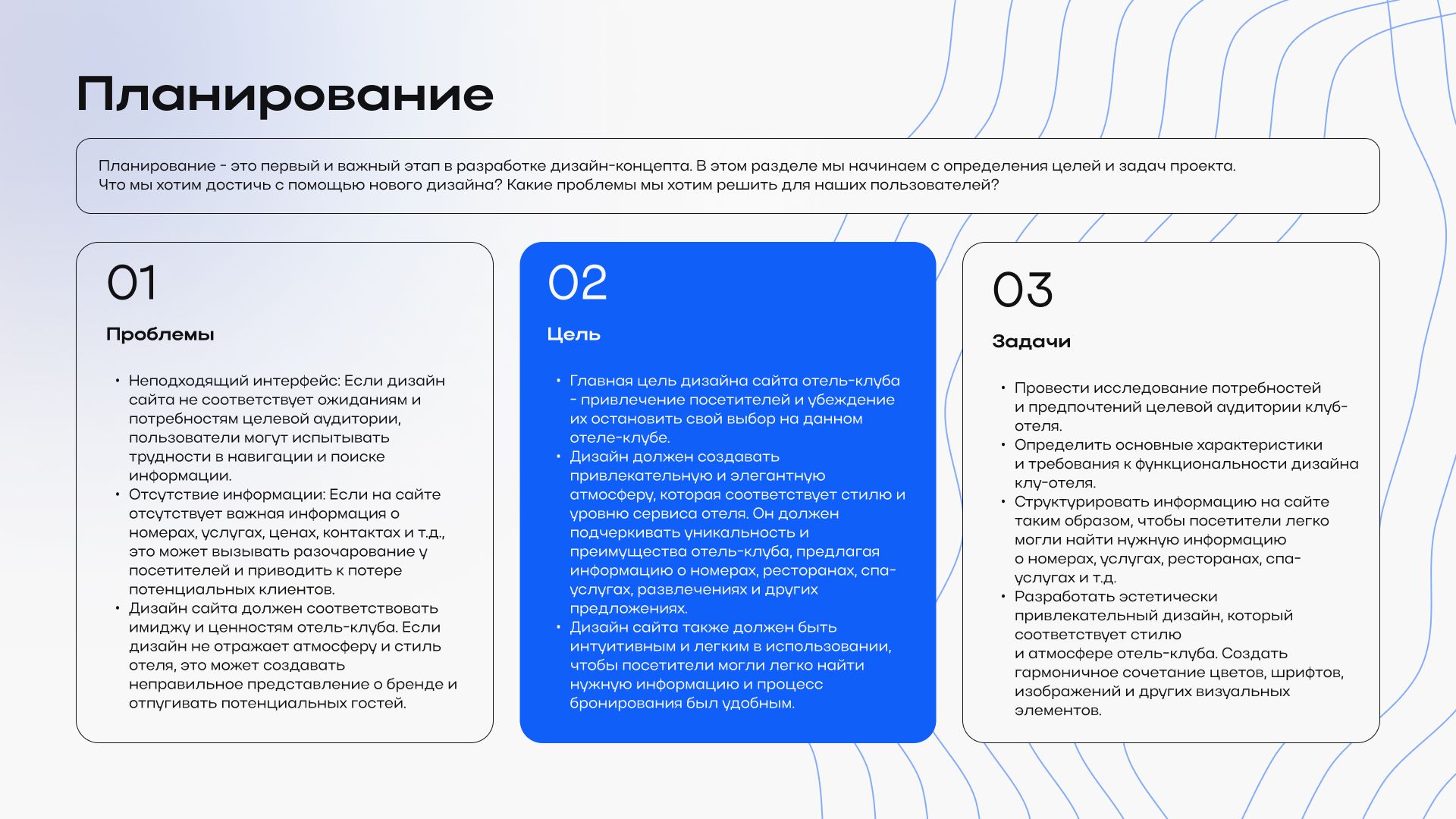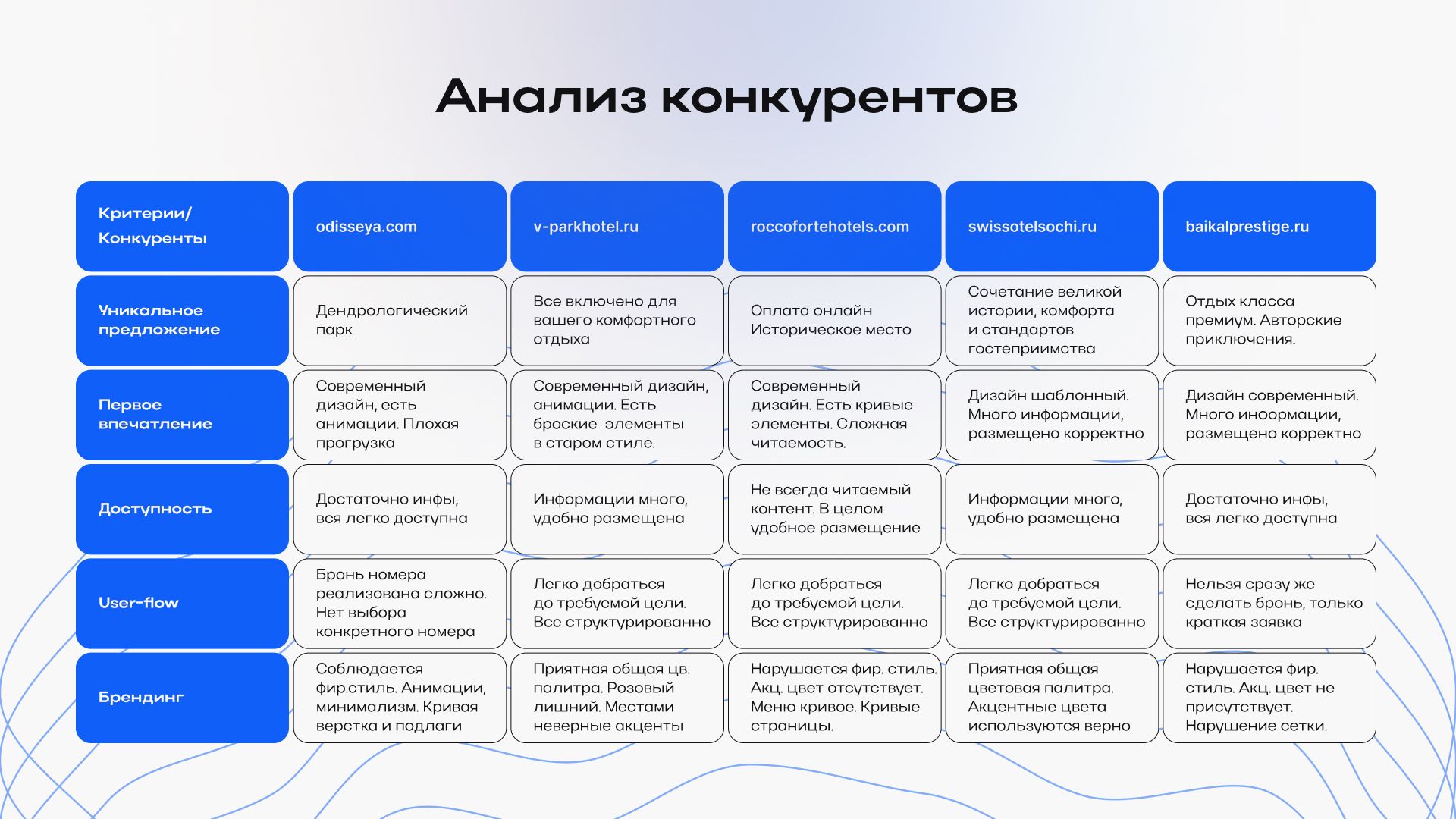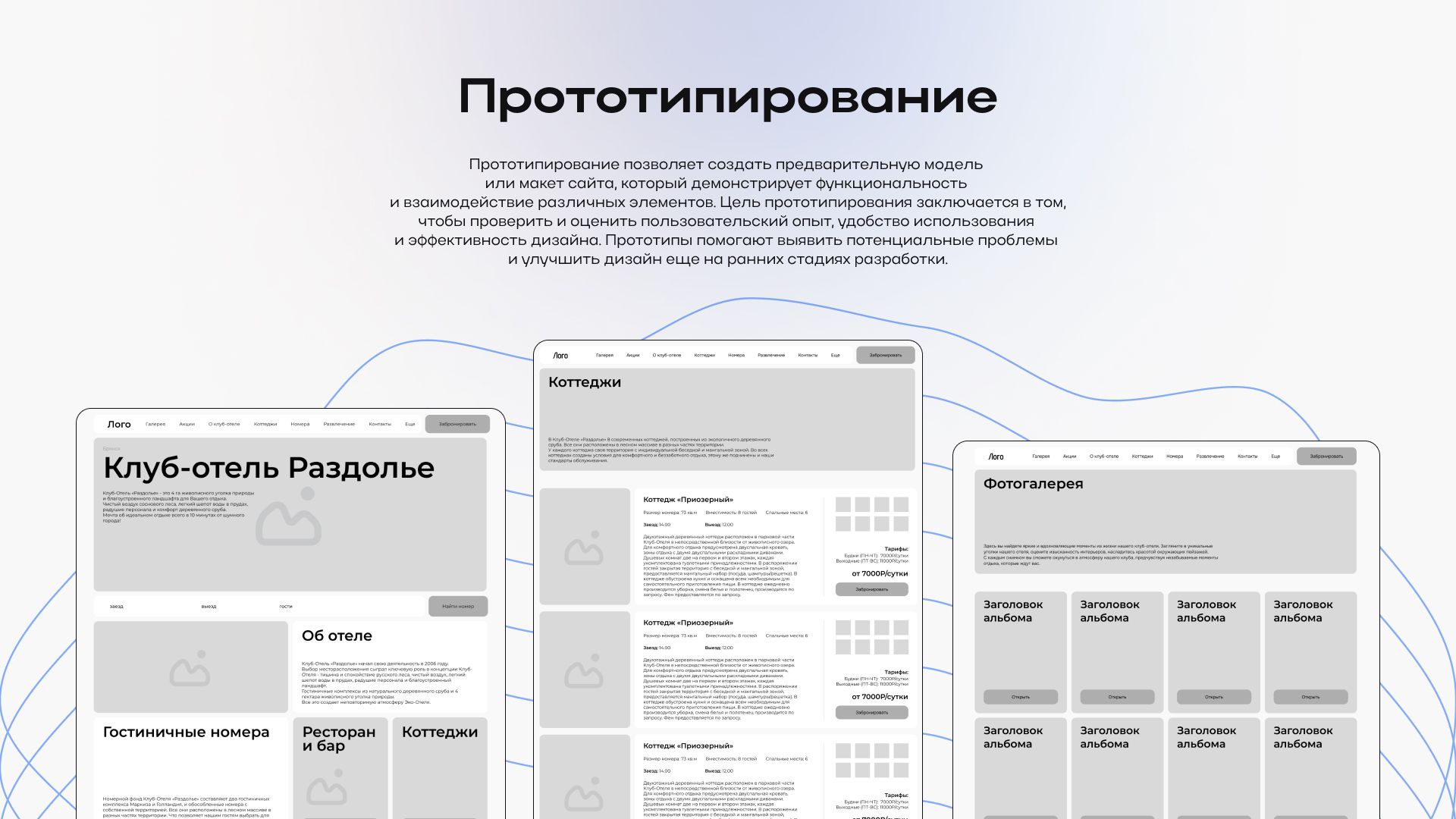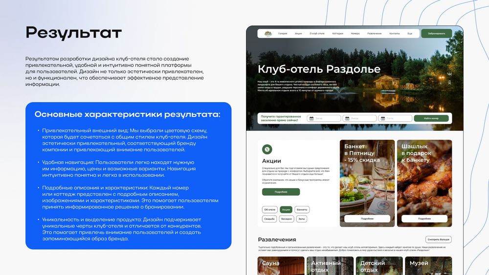 Сделала презентацию для демонстрации дизайна сайта клуб-отеля «Раздолье». Задача была упаковать процесс и результат так, чтобы все читалось быстро и логично: от анализа и структуры до финального интерфейса.