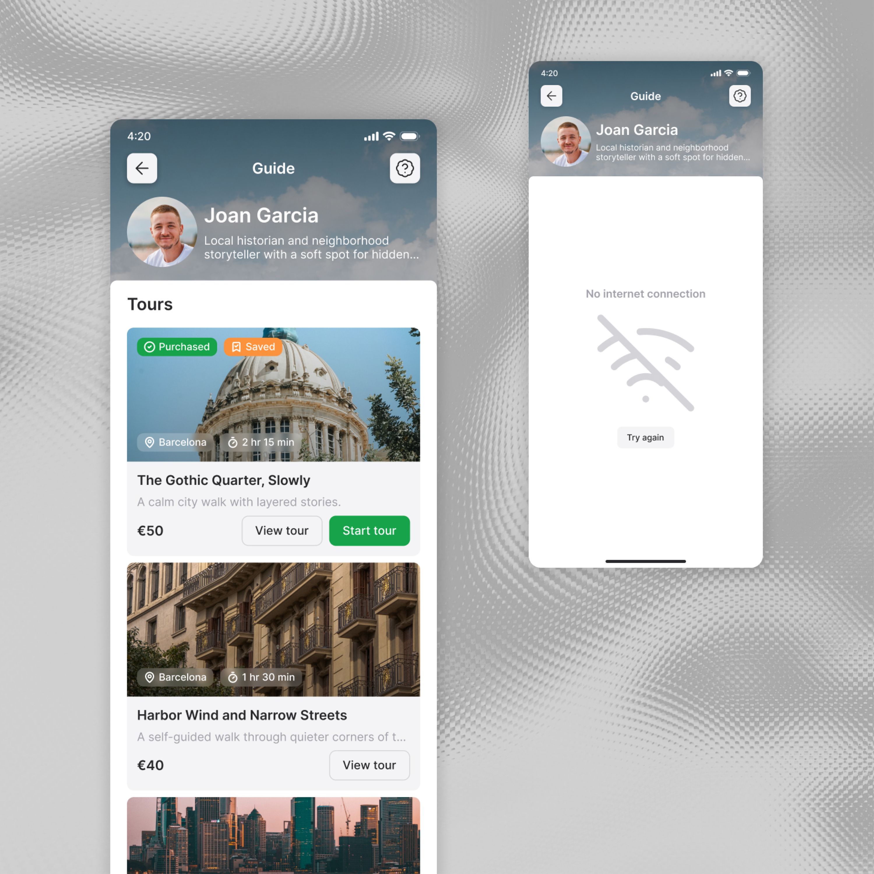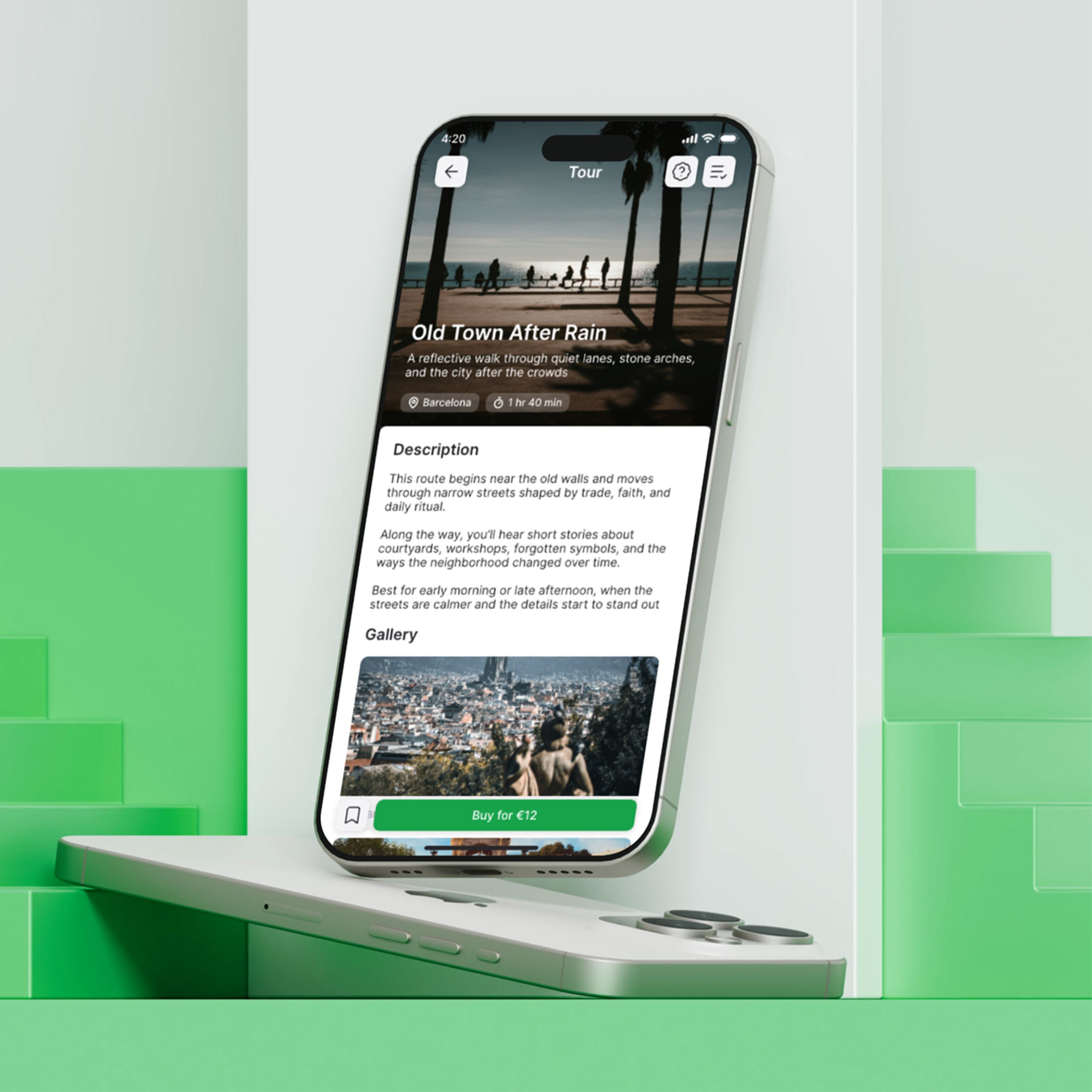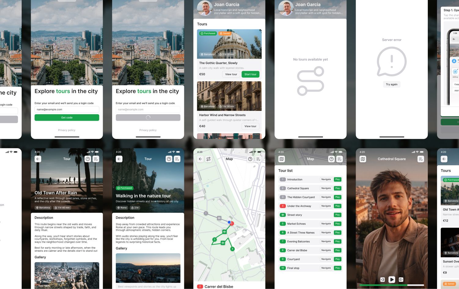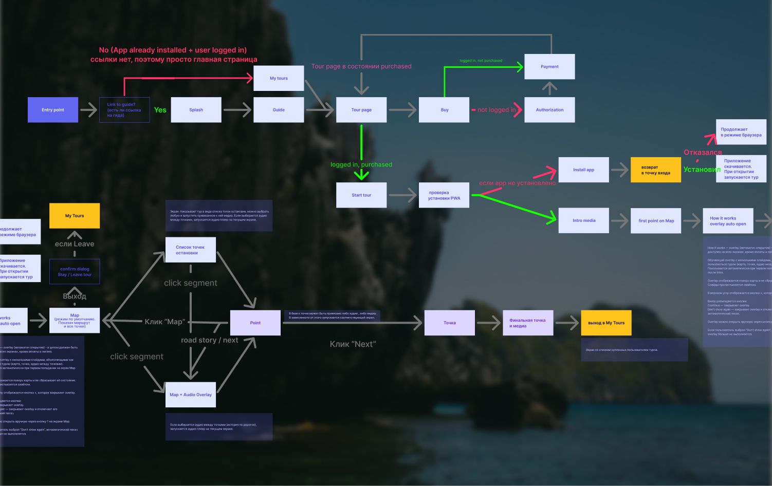Создать продукт, в котором пользователь может начать тур без регистрации, сложных действий и скачивания приложения - прямо из браузера. Продукт - мобильное приложение с аудиогидами по городам, позволяющее пользователю проходить маршруты в своем темпе. На момент начала работы отсутствовала проработанная UX-логика и единая структура экранов